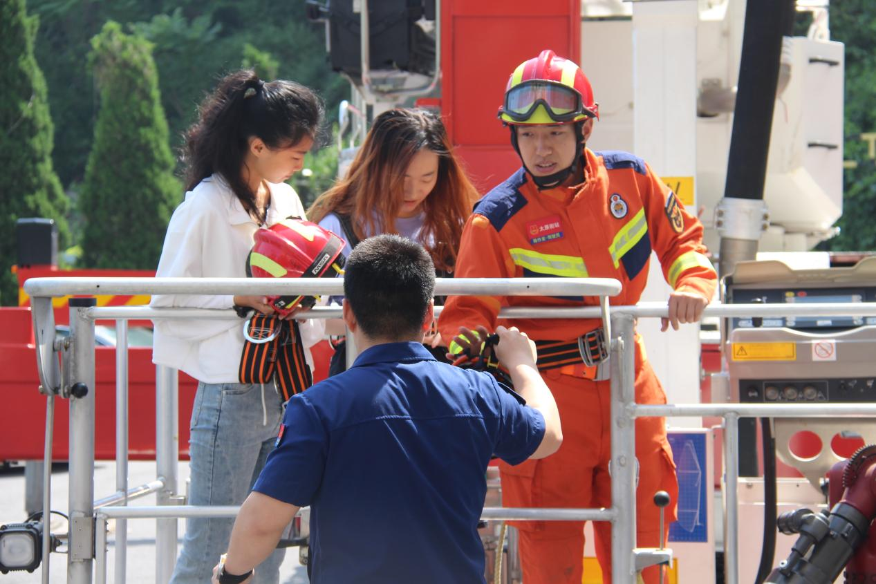 消防指战员为同学们讲解了各种消防器材组的操作使用方法,展示各类消防救援车辆性能作用,邀请同学们登上消防安全宣传车进行参观学习,其中对博浪涛101米登高平台消防车的详细讲解和现场演示引起了学生们的浓厚兴趣,这款车目前是大连唯一一辆,也是大连最高的登高平台消防车,曾经在凯旋国际大厦火灾中显现英勇本色。